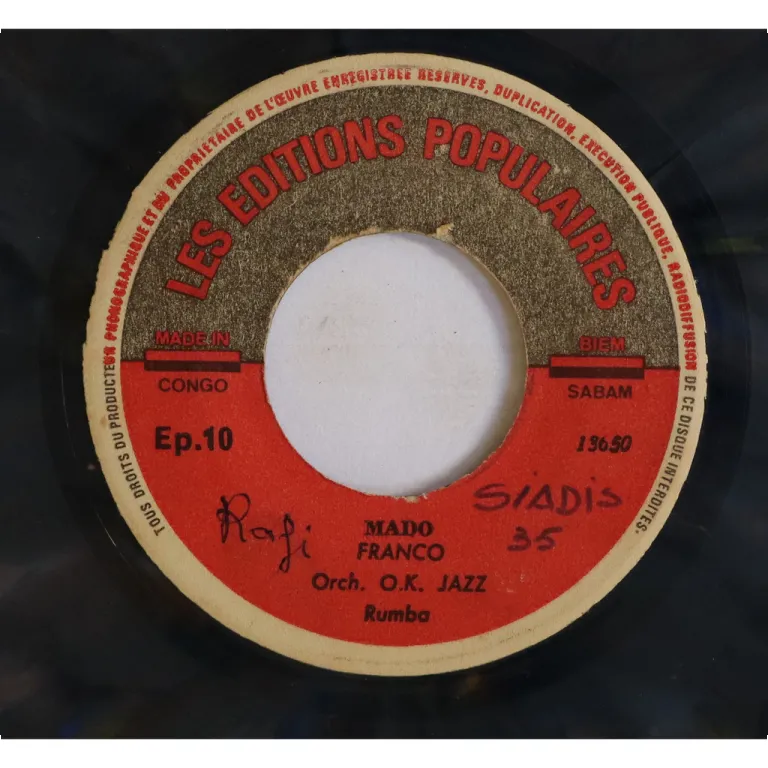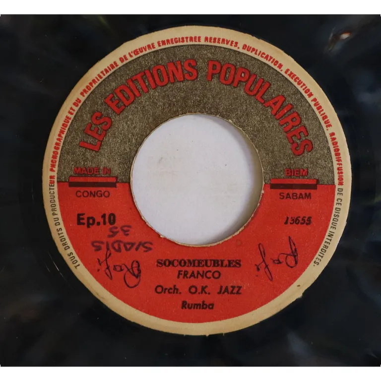 Ultra rare single only rumba soukous double sider by Congo's legends, including a tune advertising a furniture store, blue translucent vinyl pressing, writings on labels, record has constant
