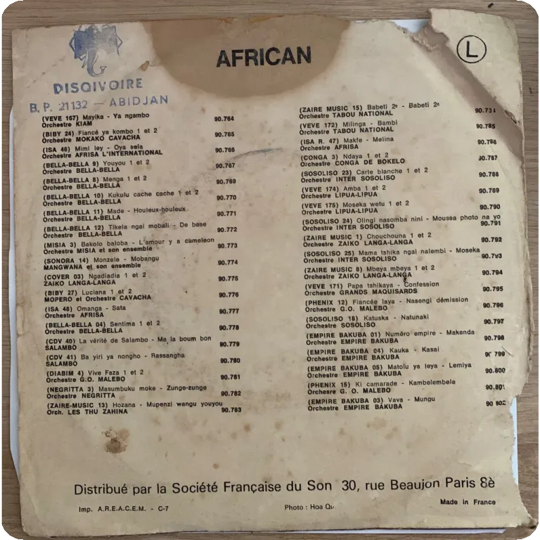 Afrbeat break on intro thn drops into a mellow rumba & part 3 is a swinging soukous on side A. B side is a straighter soukous. Bite on spine, beige stain on top, rubber stamps on back & B side label