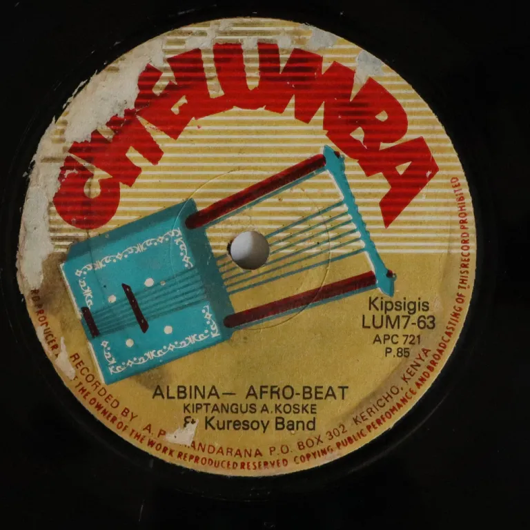 Ungoogleable Kenya folk & benga sung in kipsigis language. Strong dirt & some peel off on labels. Record is VG- to VG, reasonable to light noise from marks, bite on edge didn't reach the grooves, a few clicks