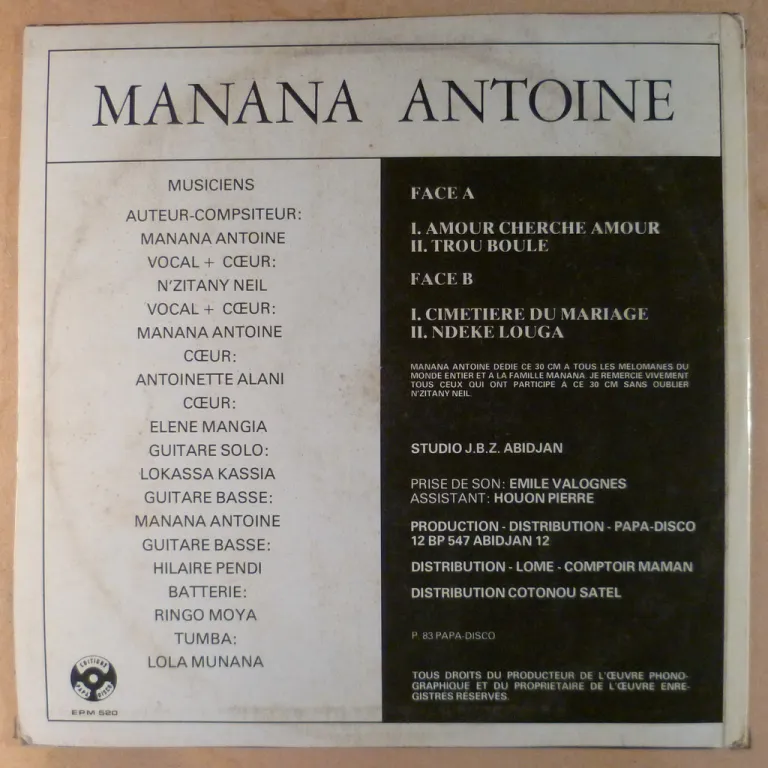 Dancefloor soukous and afro pop recorded in Abidjan by Congolese artist, light dirt wear on cover. Record has reasonable to hardly noticeable noise from both marks & opaque pressing, plays VG- to VG.
