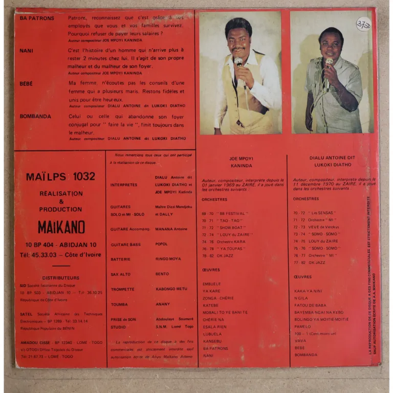 Mid tempo tropical dancefloor soukous masterpiece recorded w/ Dizzy Mandjeku, Manana Antoine, Bopol Mansiamina, Ringo Moya, Kabongo Wetu, Dally KImoko. Minor wear small price sticker on back. Record plays greatly despite light marks, only a slightly noisy right on side intros.