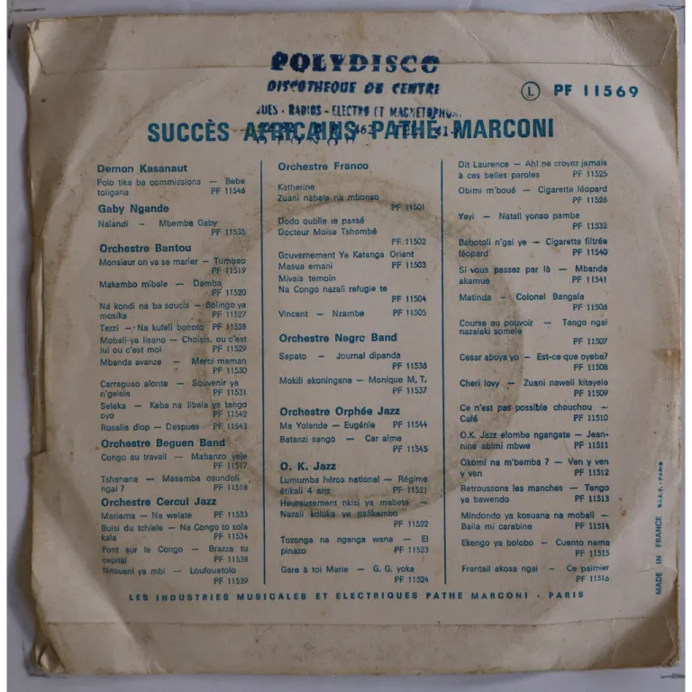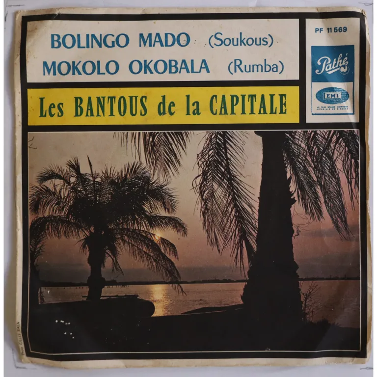 2 single only rumbas by the Brazzaville superstars, later compiled on LP, sleeve has aging & dirt, bite & tears on mouth, 5" split on spine, 3" split on top, ringwear & shop stamp on back, writings on