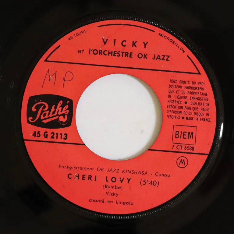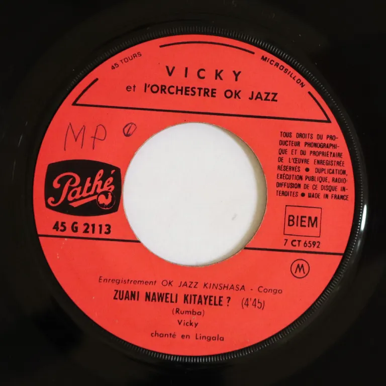 Congo rumba on top as recorded by Vicky with Franco and his legendary group on an impossible to find 7" single apprently never offered here nor on discogs. Small writings on labels. Record is VG- to VG, light noise to hardly audible noise from marks