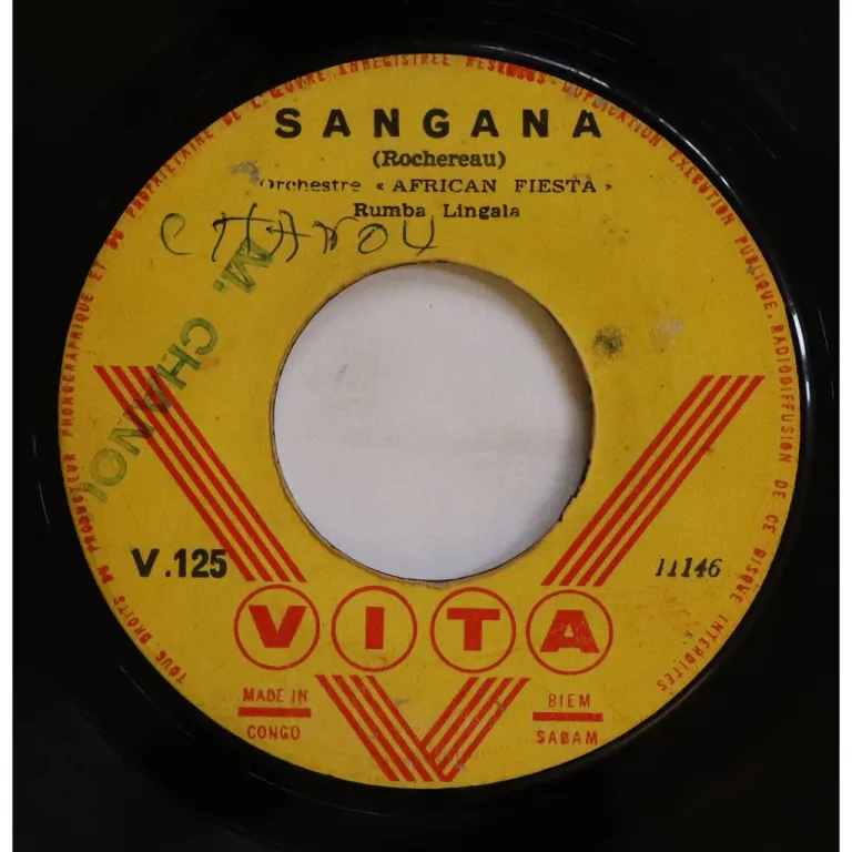 Congolese rumba sweetness double sider. Rubber stamps & writings on labels. Record plays w/ constant noise from numerous marks, solid G to VG- depending on parts.