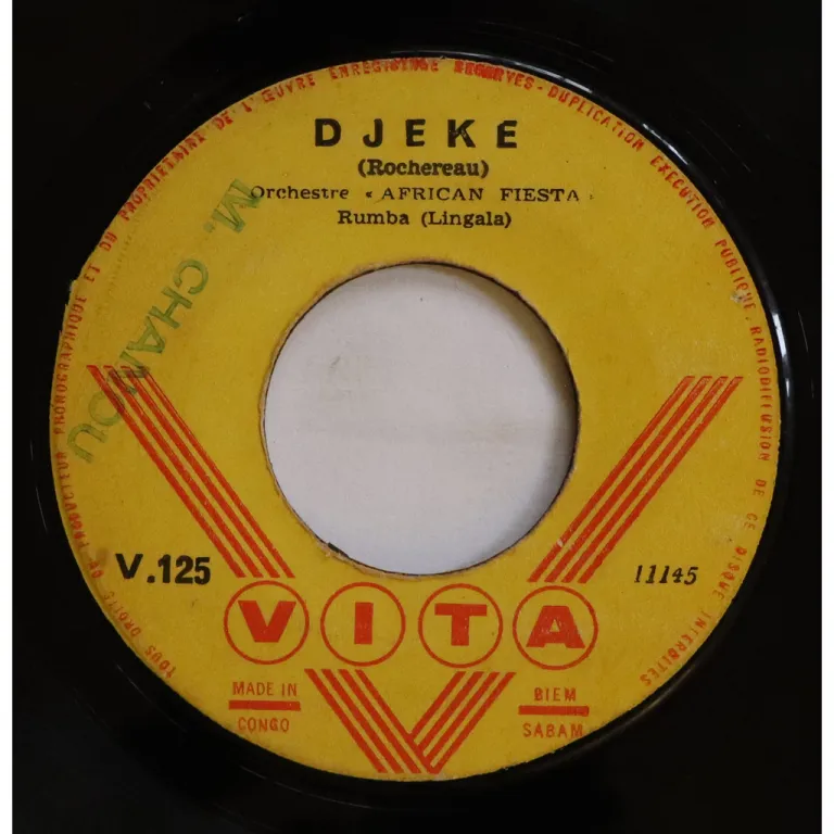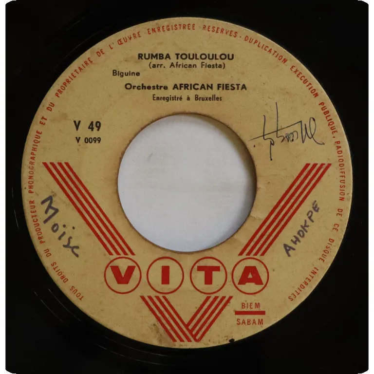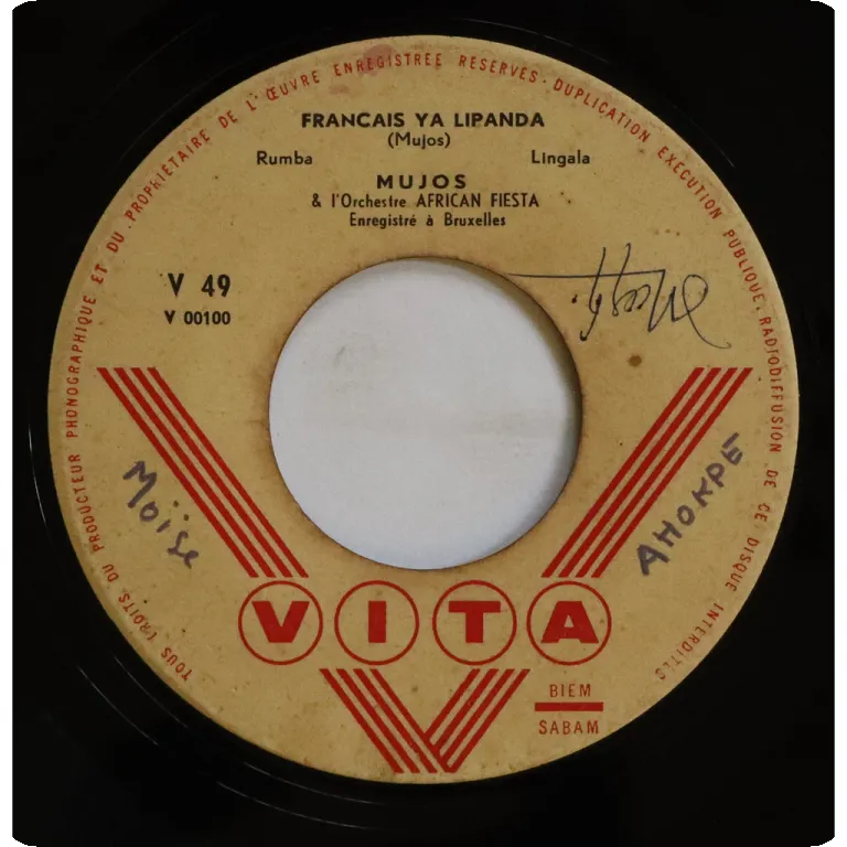 Rumba double sider by the Congolese legends recorded for the collectible VITA label. Stickers & wear on labels. Record plays G to VG- w/ constant strong to light noise from numerous marks.