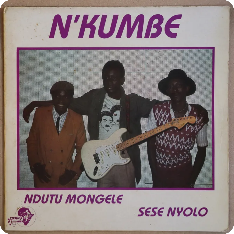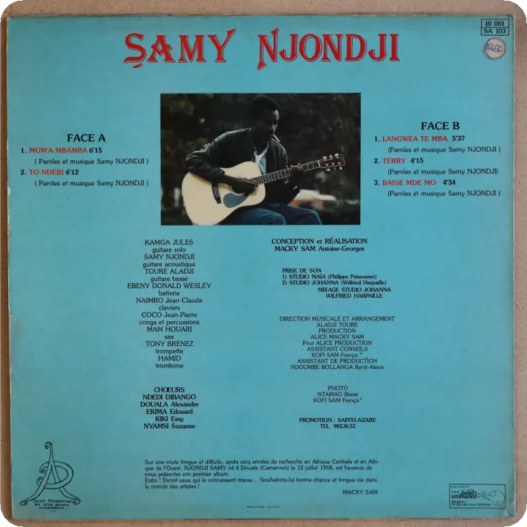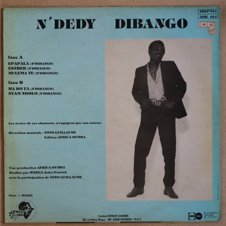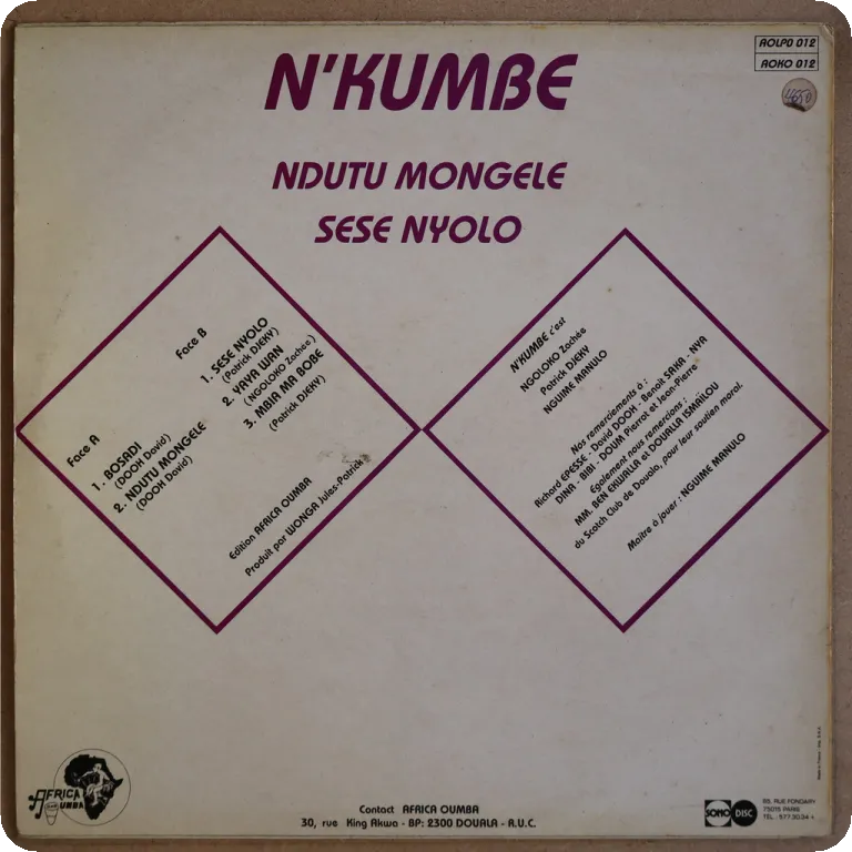 Solid tropical dancefloor winner afro pop / makossa tunes as recorded in Paris by this Cameroon artist, sleeve has strong dirt, earth resiudes on front, bite on mouth, price sticker on back, record