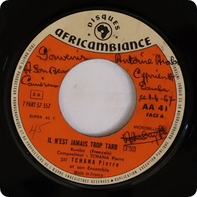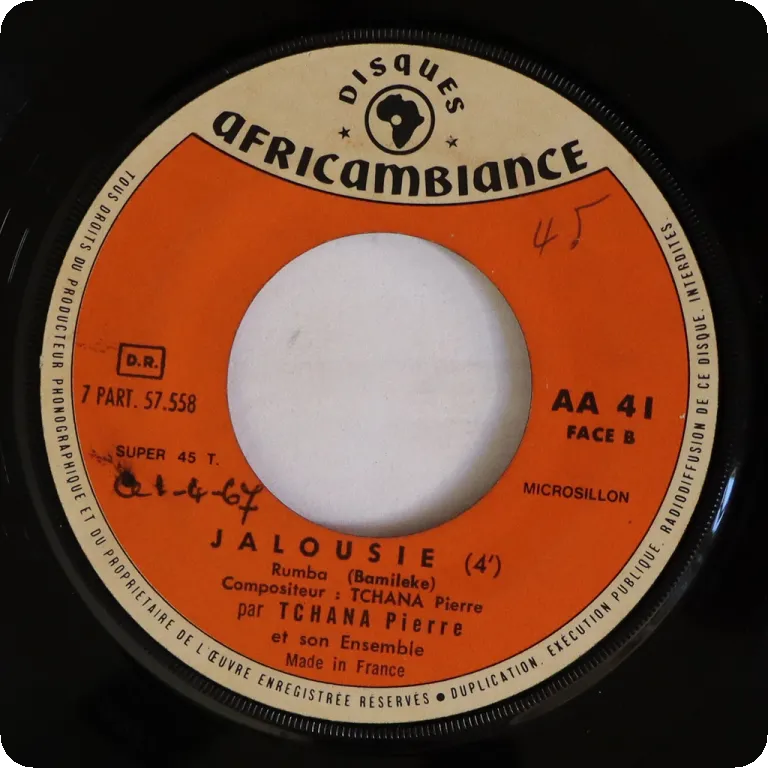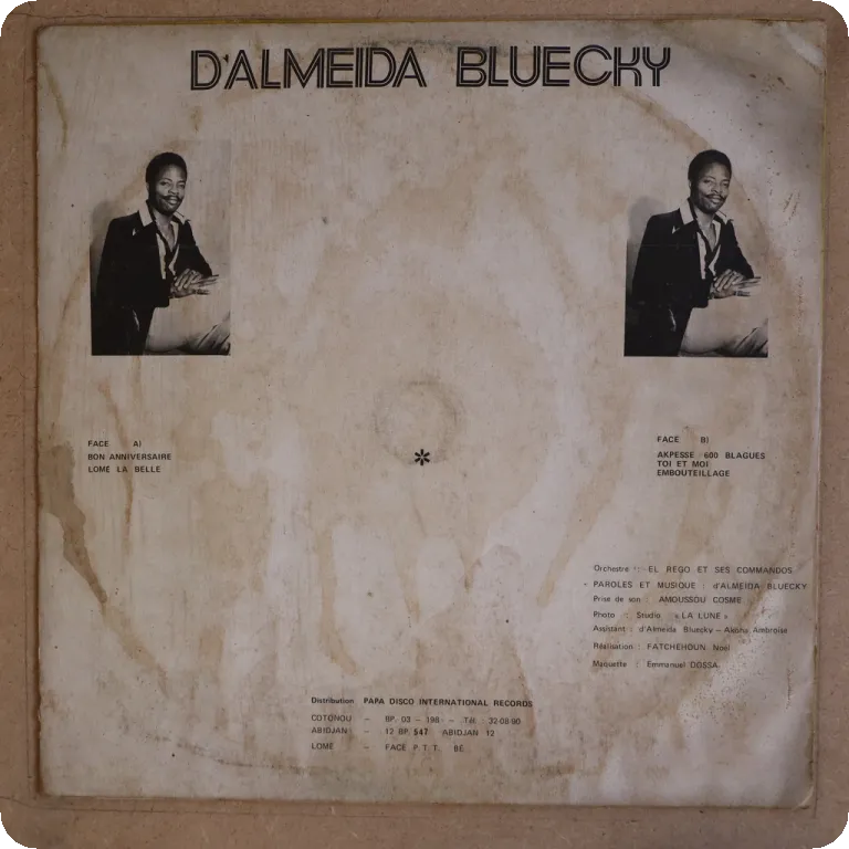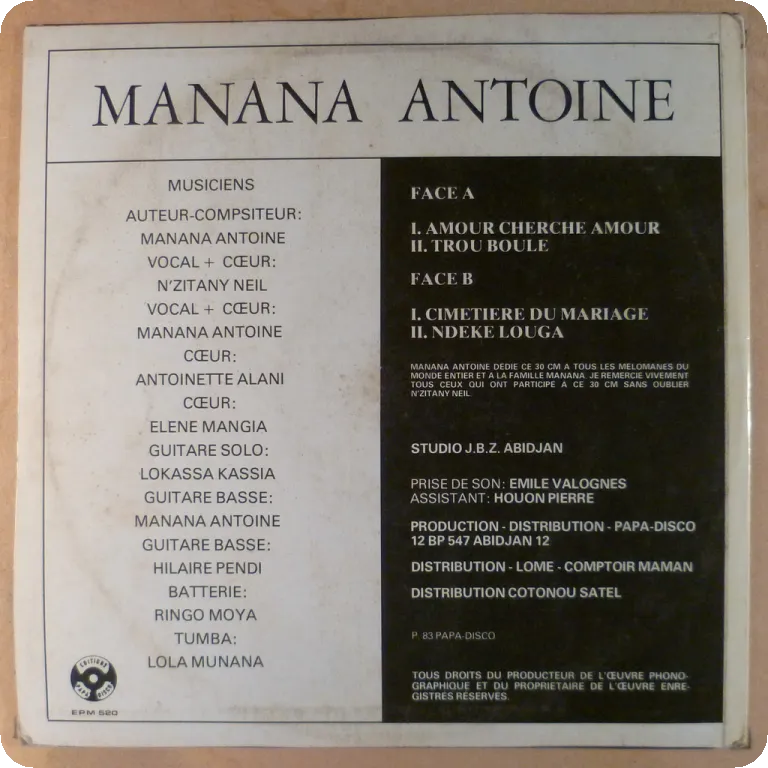 Ultra rare soukous & afropop as recorded by this less successful Benin singer / guitar player. Sleeve is VG+ w/ Minor wear & dirt. Record is VG- to VG w/ very reasonable to very light noise from marks depending on parts, main issue is I cracked the record while cleaning it, so it causes clicks, paticularly on B side (clip 4)
