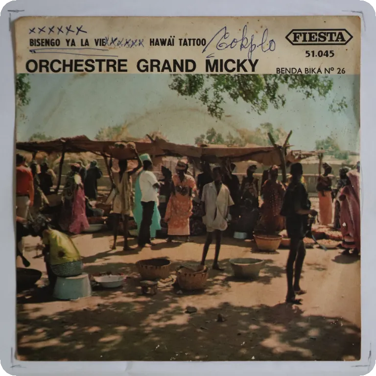 2 single only rumbas by the Brazzaville superstars, later compiled on LP, sleeve has aging & dirt, bite & tears on mouth, 5" split on spine, 3" split on top, ringwear & shop stamp on back, writings on