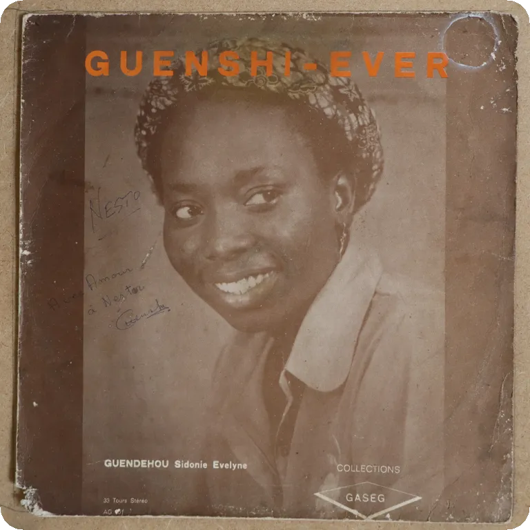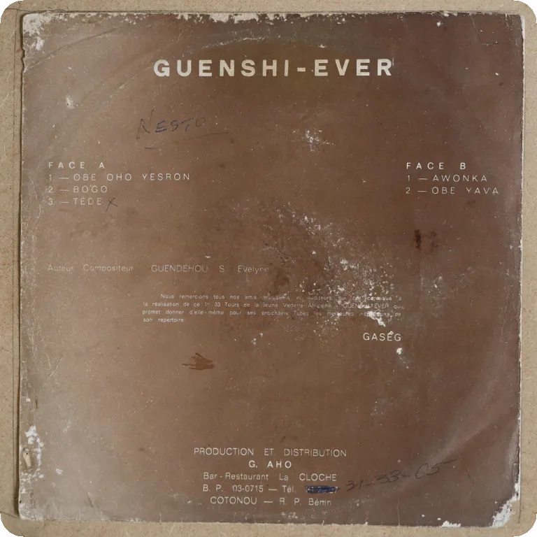Record missing, cover only w/ aging & dirt, writings, small bite on bottom spine, white colouration ring on top front, multiple mini peel off, discolouration along mouth on back