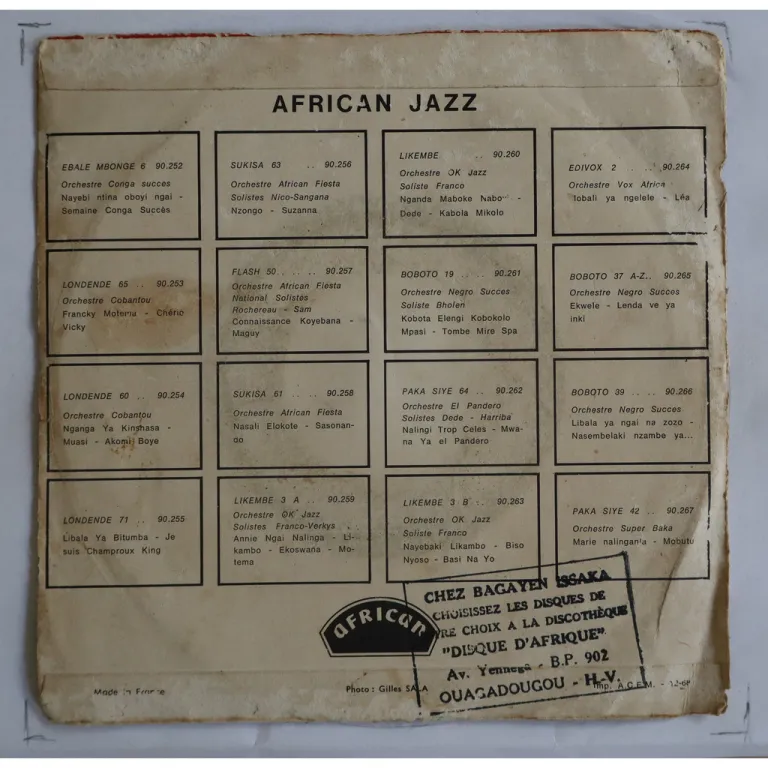 60's rumba single only rarity by one of the legendary Congolese orchestras, sleeve has strong wear, bites on spine & mouth, multiple small peel off, writings & rubber stamps on back & labels, writings