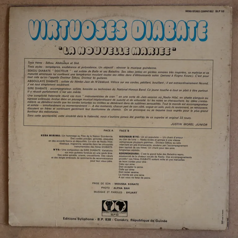 The three Diabate brothers deliver an acoustic manding guitar LP. Minor wear on cover, writings on labels, light to hardly noticeable noise, solid VG- to VG depending on parts.
