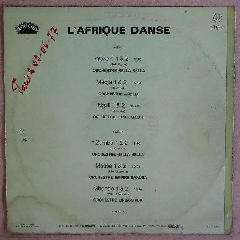 Hard hitting uptempo raw soukous tunes & a laid back rumba soukous swinger on one of the rarest of the L'afrique danse volumes released by the label, previously released material taken from 7" single, sleeve has some aging & dirt, writings on back & labels, split on all bottom, record has surface marks & light to hardly noticeable noise, solid VG- to VG.