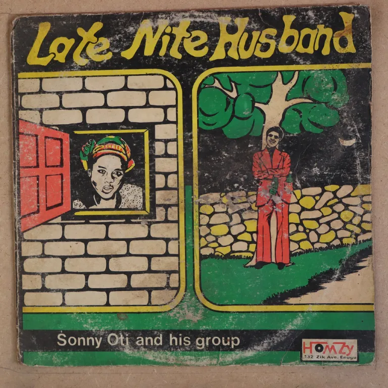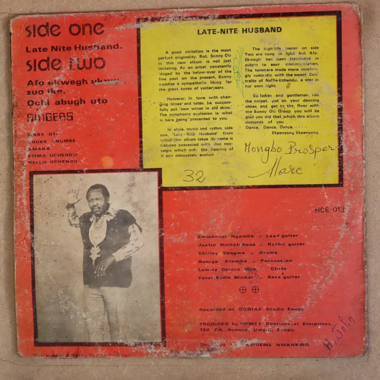 Check the hypnotic tune on this Nigerian Ibo highlife rarity which also blends together highlife w/ gospel vocals..Sleeve w/ strong aging & dirt, strong ringwear, writings on back & labels, small peel off on front. Record plays w/ constant reasonable noise from numerous marks.
