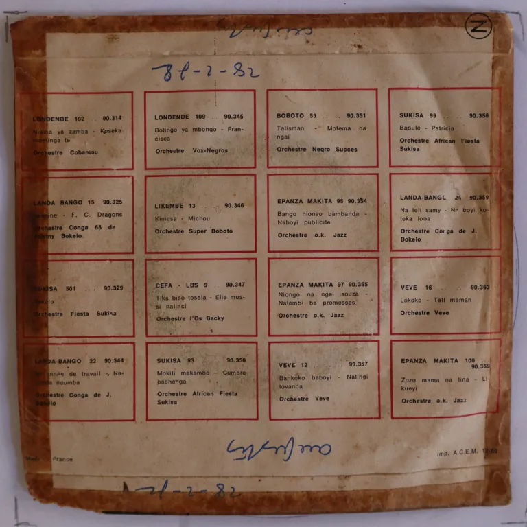 Rumba rarity out of Congo with rocky rumba on last part of both sides. Strong wear on cover, glue residues along seams & mouth, writings on cover & labels, narrow bite on bottom mouth corner, warp, dirt on labels,plays with constant reasonable noise from marks.