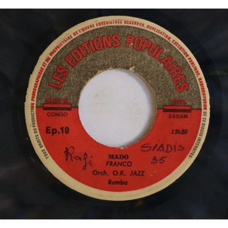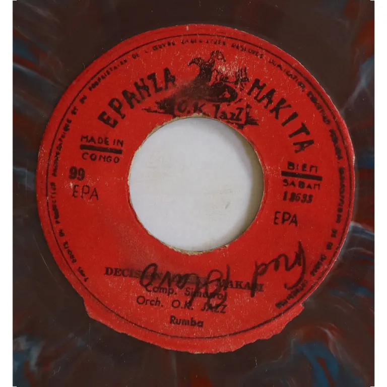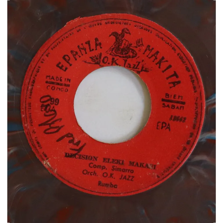 Ultra rare single only rumba soukous double sider by Congo's legends, including a tune advertising a furniture store, blue translucent vinyl pressing, writings on labels, record has constant reasonable pressing hiss.