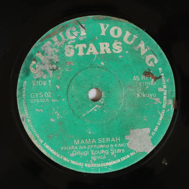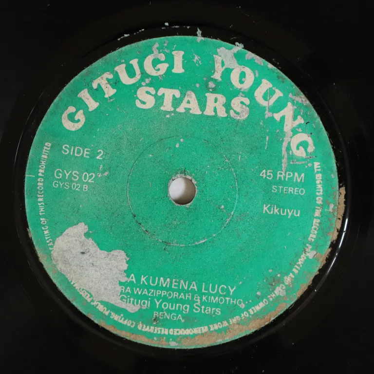 Kenya benga rarity sung in Kikuyu language, check the floor potential on B side's best playing track w/ male female spoken word dialogue and a kick off on part 2. Strong wear & peel off on labels. Record is VG- to VG, best tune plays quite well despite mini pressing dimples and marks, a bit noisy on intro, A side is noisy from a mark on first part then plays better.