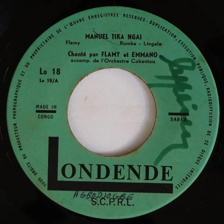 2 rumbas recorded by this renowned Congolese band for this ultra rare single only release. Large writings on labels, record has marks & constant reasonable to light noise from marks.