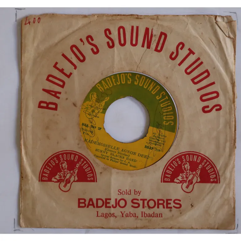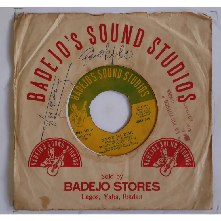 A highlife and a bolero on this ultra rare release by the band which would later become Orchestre Poly Rythmo. Sleeve has aging & dirt, shop stamp, 2" split on side edges, tear on center hole, writings on cover & B label, dirt on labels, record has light to hardly noticeable noise, nice copy.