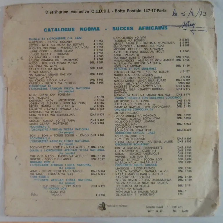 Congolese rumba rzrity on the legendary Ngoma label. Strong wear on cover, peel off, small bites & holes, writings on cover & labels, plays with reasonable to light noise fromnumerous marks.