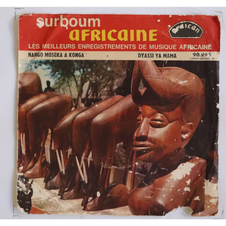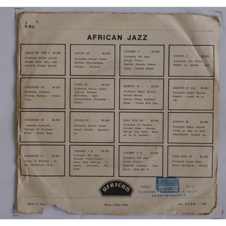 Single only Congo rumba double sider rarity by Johnny Bokelo and his 60's group. Never shows up ! Sleeve has aging & dirt, bite on bottom seam & spine corner, peel off, creases, shop stamp & mini writing on back, record has very minor light to hardly any noise, solid VG to VG++
