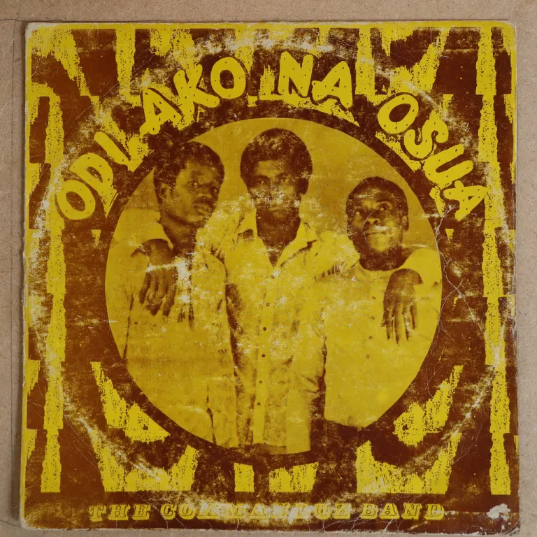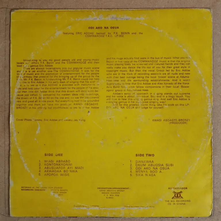 Record missing, cover only w/ aging & dirt, writings, small bite on bottom spine, white colouration ring on top front, multiple mini peel off, discolouration along mouth on back