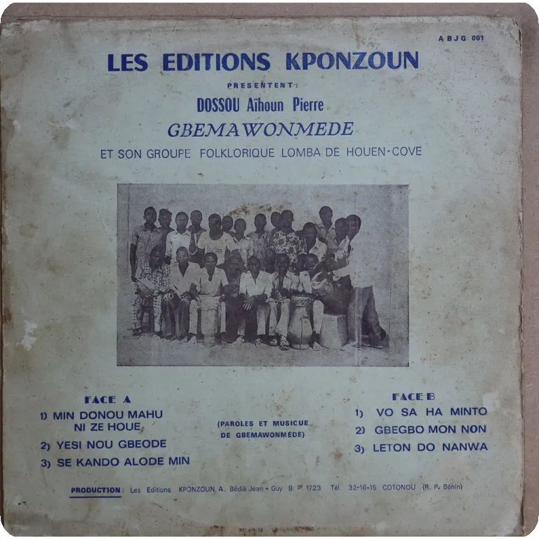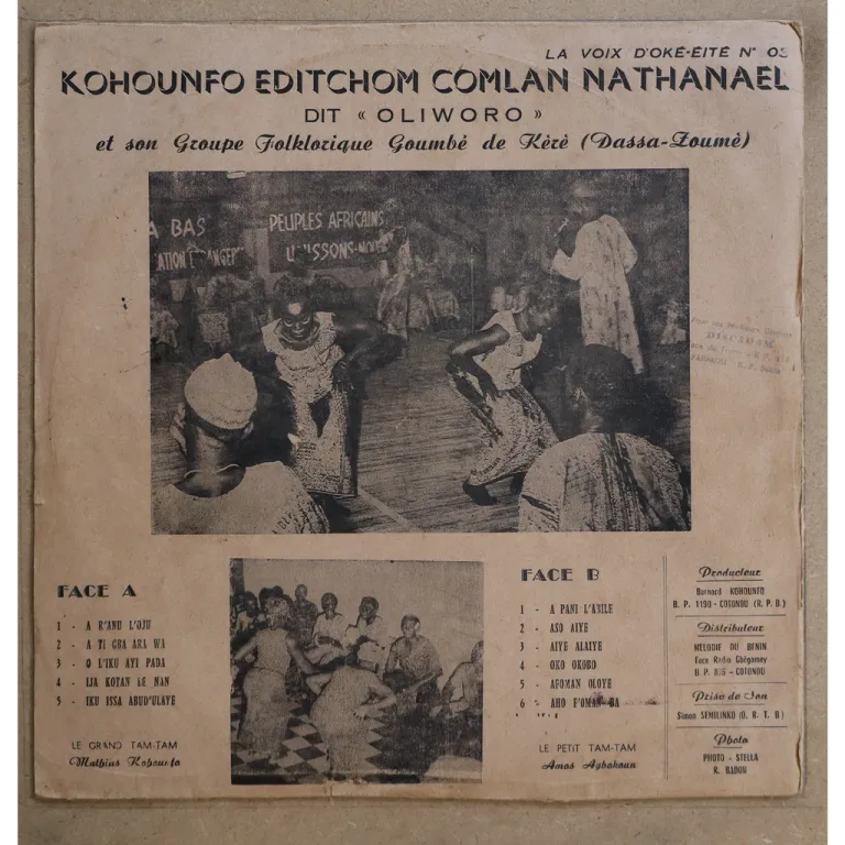 Dassa city region Benin folk music by one of the country's leading figures of the genre, scarce title, sleeve has aging & dirt, ringwear, shop stamp on back, peel off on bottom front, 2,5" split on spine, 1,5" split on top & bottom, record has marks & reasonable to light noise ranging from VG- to very solid VG- depending on parts.