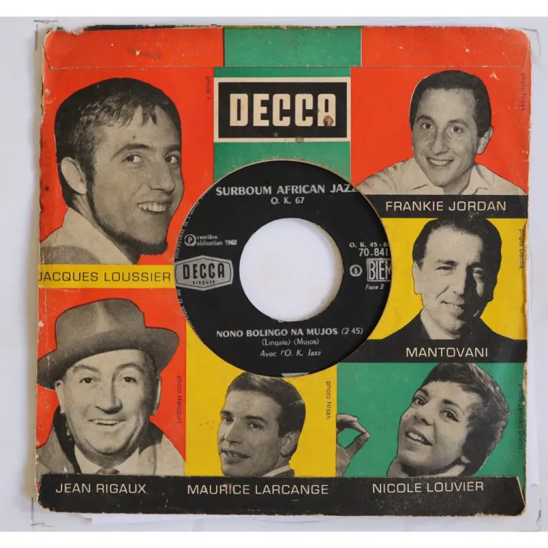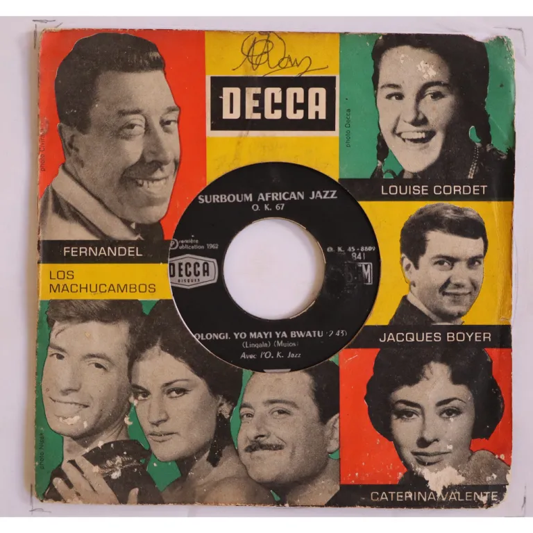 Congolese rumba double sider rarity by the legendary group. Sleeve has aging & dirt, some peel off & writings on front, fading of the text on A side label biem logo & side mention, record has light to hardly noticeable noise, very solid VG- to VG+.