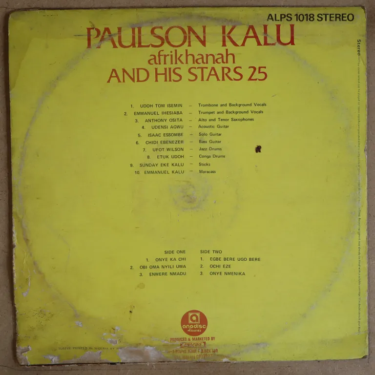 Consistent Nigerian ibo highlife rarity w/ down & uptempo tunes. Dirt & aging on cover, peel off & beige water damage, strong ringwear. Record has very reasonable to hardly noticeable noise from marks, solid VG- to VG/VG+.