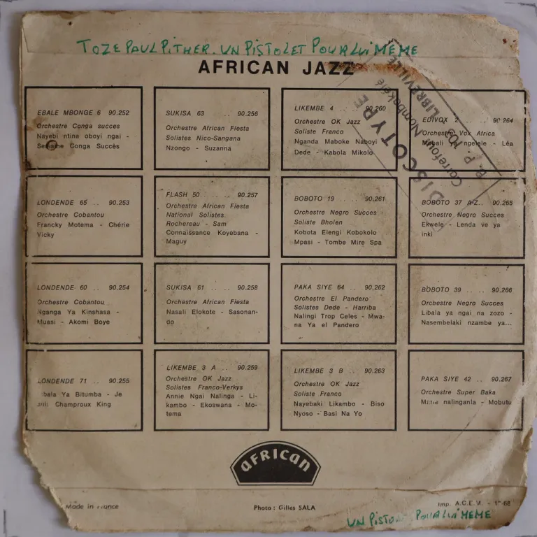 Congo rumba double sider rarity by the country's leading figures, sleeve has strong wear, narrow bites on edges, 1,5" split on top, shop stamp on back, peel off, record plays with extremely light to
