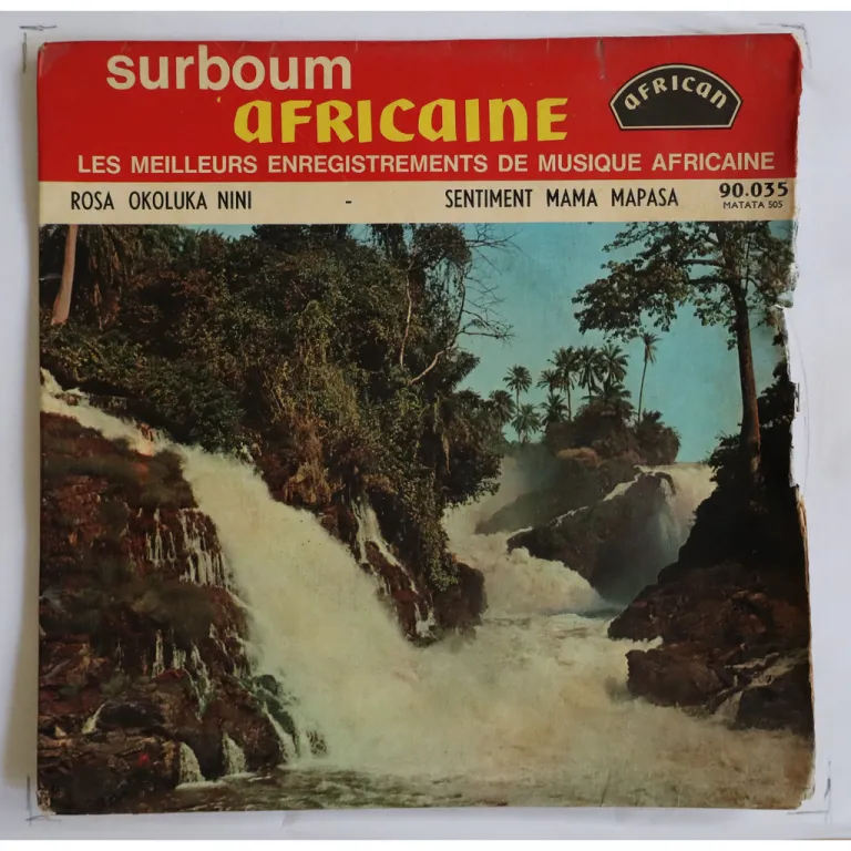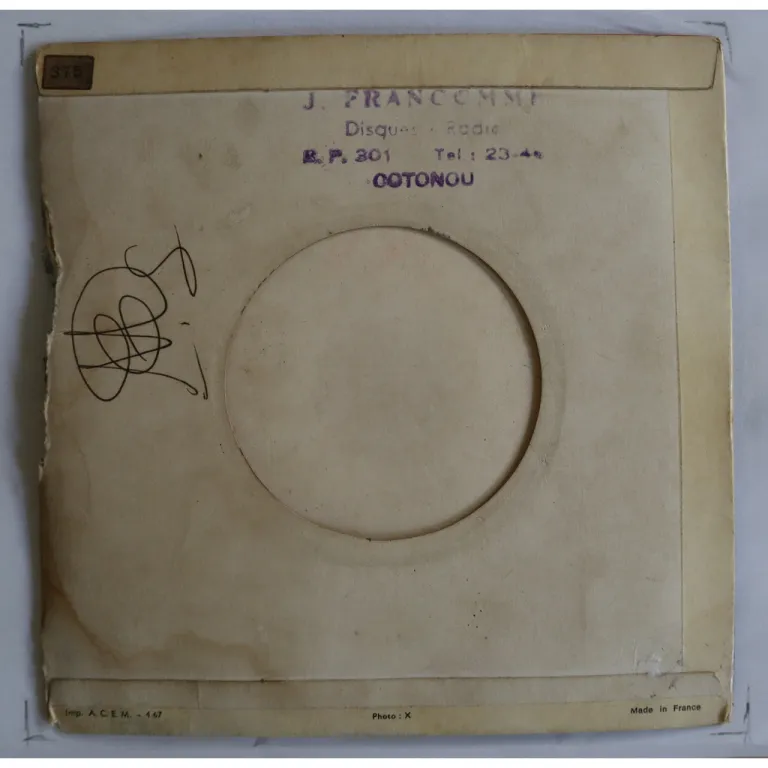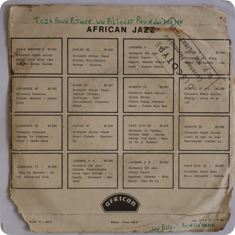 60's rumba single only rarity by one of the legendary Congolese orchestras, sleeve has strong wear, bites on spine & mouth, multiple small peel off, writings & rubber stamps on back & labels, writings