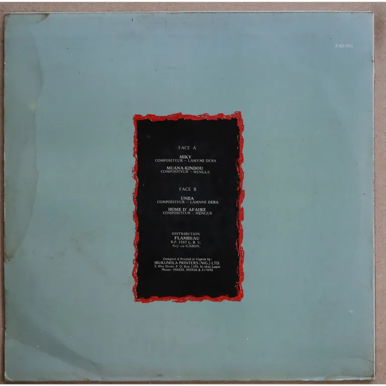 2 Tropical dancefloor uptempo soukous winners on this ultra rare Nigeria only Congolese soukous rarity. 2" wide vertical light beige water damage stripe along mouth, dirt wear, white discolouration stains on front, writings on labels, record has strong to hardly audible noise, worse part is first half of one of the standout tunes, B1, which has visible damage and only plays G there, otherwise ranges from solid VG- to solid VG