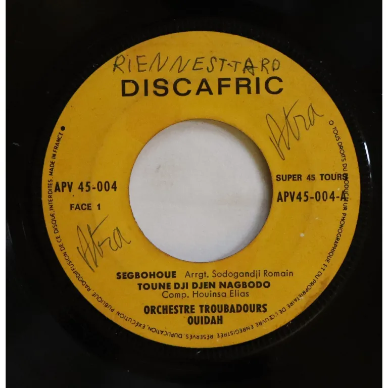 Deep hypnotic afro winners on this mega rare Benin release. Sleeve is missing. Writings on labels, record has numerous marks constant stroNg to light noise, ranging from weak VG- to weak VG