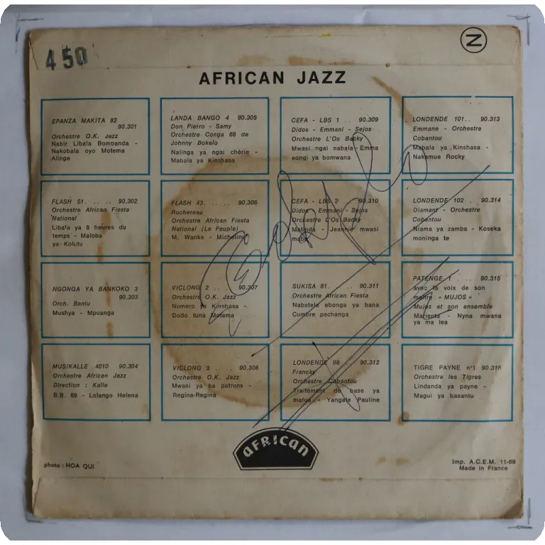 Solid soukous double sider w/ 2 long transy tracks, sleeve has some light dirt wear & aging only but has large writings on front & labels, record has some noise on intros otherwise plays quite well despite numerous marks.