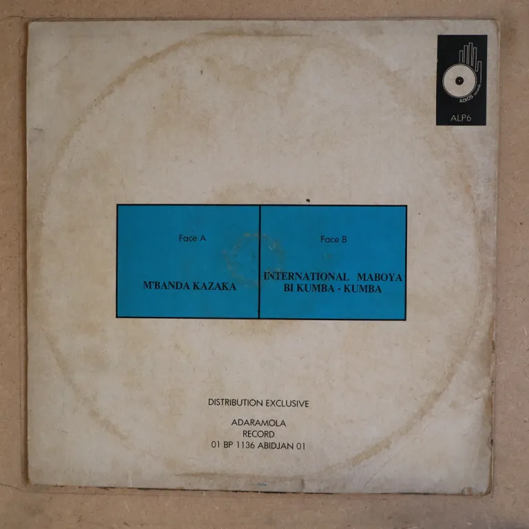Abidjan soukous session by the Congolese superstars, sleeve has dirt wear & aging, ringwear, bump & 2 small tears on mouth, small tear on bottom, light creas, record has opaque pressing hiss on most A side (clip 1) but B side only has light to hardly noticeable noise despite marks.