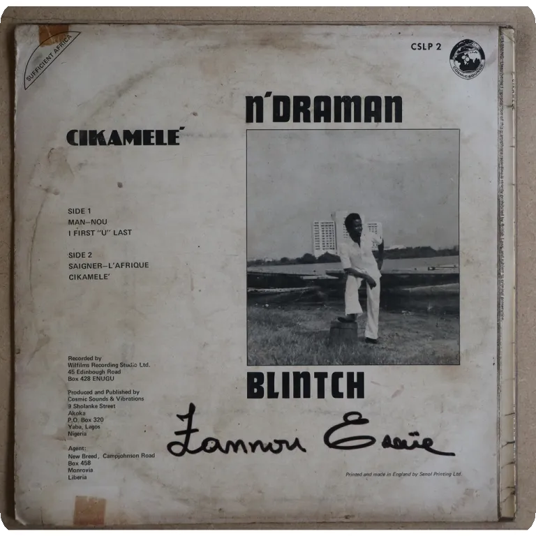Deep, hybrid syncopated afro pop & afrosynth mellowness w/ clear voudoun influence w/ backing by the kings of Benin, sleeve has light wear, faint writing residue on front, writings, light brown stains & small peel off & ringwear on back, writings & dirt on labels, record plays w/ light to hardly noticeable noise from marks, VG to VG++ depending on parts.