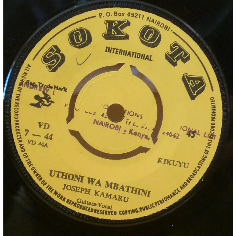 Afro folk guitar & voices double sider sung in Kikuyu w/ female chorus. Writings & rubber stamps on labels. Record plays solid VG++ despite some surface marks.