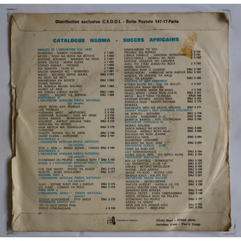 Single only double sider rumba rarity from Congo, not listed on discogs until I added it, never offered on ebay. Some dirt & aging on cover, creases. Record plays VG to VG/VG+ w/ reasonable to hardly noticeable noise from marks, noisier on first part of each side then plays better.