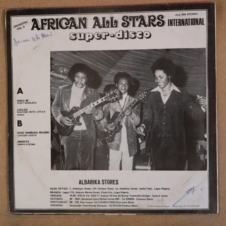 Tropical dancefloor soukous winner tune & hypnotic afro tune on this LP directed by Dizzy Mandjeku during the group's long stay in Benin and the rarest of their lp's recorded without Mangwana for Benin/Nigeria based Albarika label. Sleeve has minor wear, mini writings on cover & labels, record plays w/ light to hardly noticeable noise noticeable mainly inbetween tunes