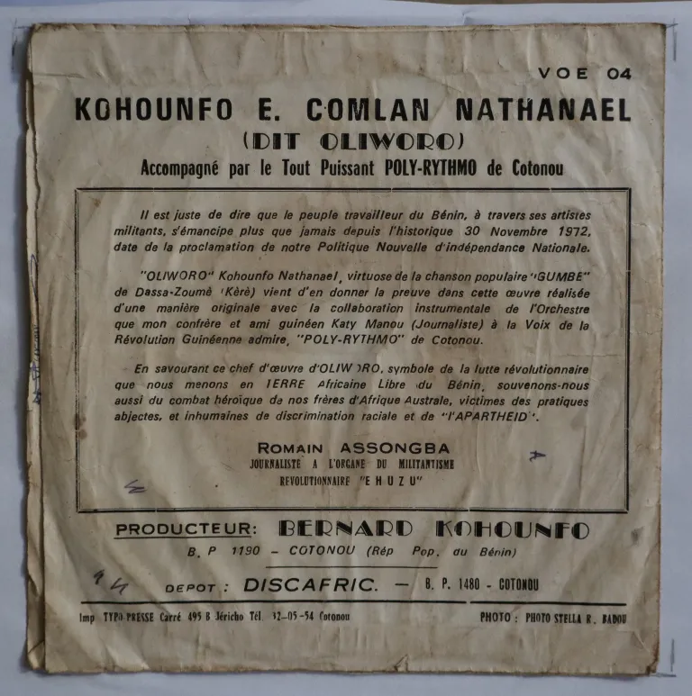 A deep hypnotic afro funk tune w/ synth solo & an afrobeat winner on this mega rare Benin release by folkmusician in an unusual encounter with the Kings of Benin's modern afrofunk vibe. Sleeve has aging & dirt, 2" split on spine, creases, small writings on back & labels, constant reasonable opaque pressing noise