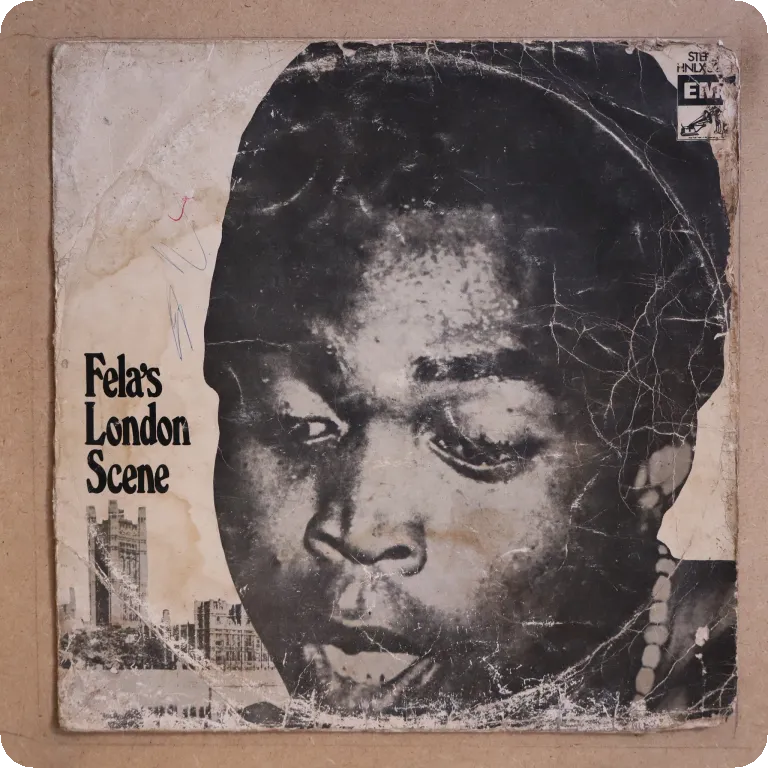 Raw early Fela Kuti, features "Buy Africa", sleeve has strong aging & dirt wear, writings, narrow bite along mouth, strong ringwear, beige water damage, creases, multiple small peel off, peel off /