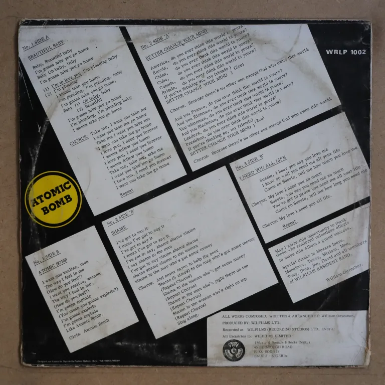 Indemand cosmic afro synth album recorded at William Onyeabor's studios. Sleeve w/some dirt & aging, large writings on back & labels, glue residues on back. Record has reasonable to light noise from