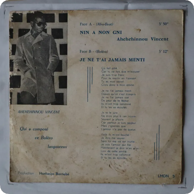 Super deep & hypnotic afro psych / afrobeat sato rhythm double sider with killer guitar solos by the KIngs of Benin, scarce title which never shows up ! Dirt wear & aging on cover, bite & 5" split on spine, creases, rubber stamp on back, mini peel off & writings on labels, record has strong to reasonable noise from numerous marks, a few strong clicks (clip 4).