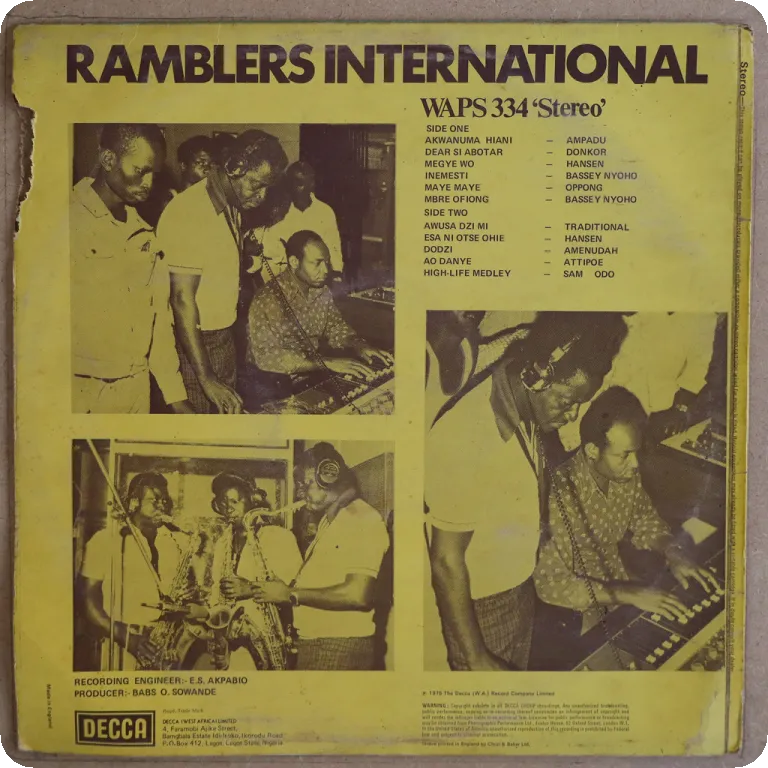 Sweet breezy cover of the soul classic "grazing in the grass", + a latin cover of "Caramelo a kilo" & "Vete pa' la luna" mostly highlife otherwise on this Ghanaian album. Peel off on front & small peel off + rubber stamp on back, record plays with light noise in parts from marks, solid VG- to VG+ depending on tunes/parts.