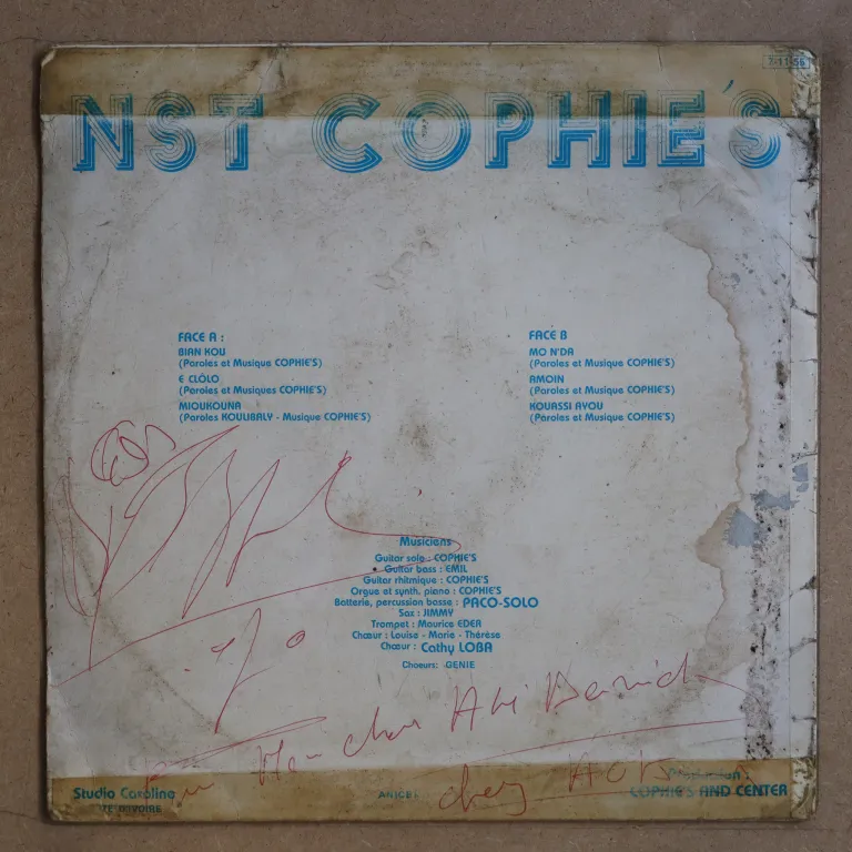Boogie disco from Africa, self produced. Sleeve has aging & dirt wear, creases, large writings on back, large beige water damage, glue residues along top & bottom visible mainly on back, mini peel off on B side label, record has marks & very reasonable to very light noise, ranging from solid VG- to VG/VG+.