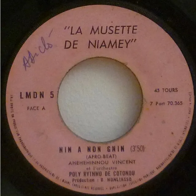 A highlife and an afropop on this mega rare privately produced Benin release. Brown stains on labels. Record is VG- w/ cosntant light noise from marks