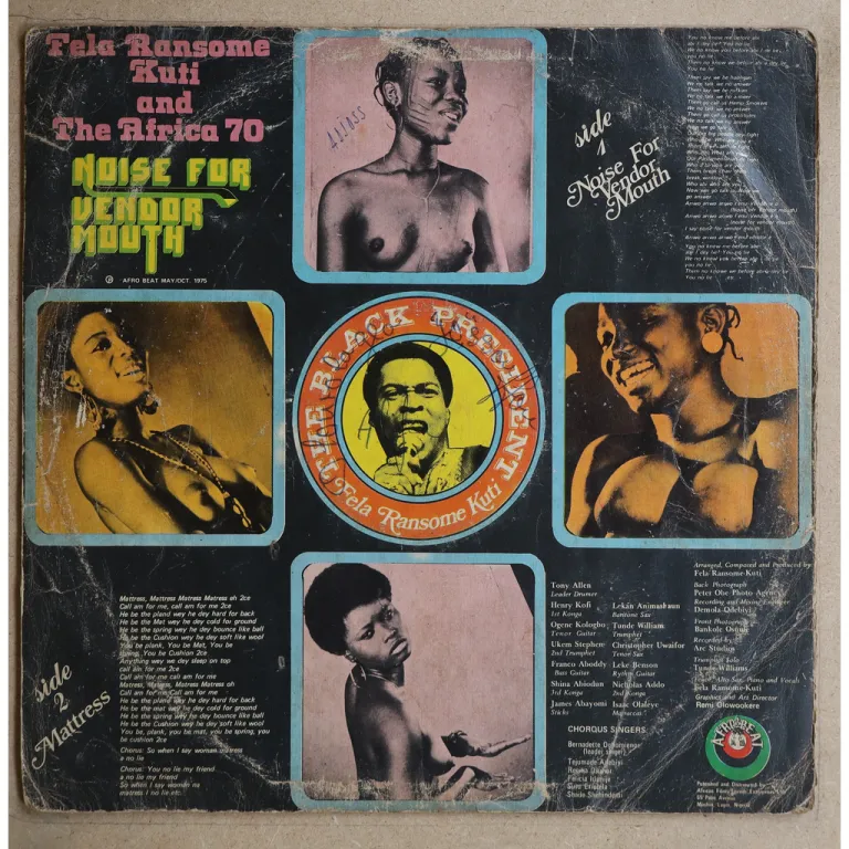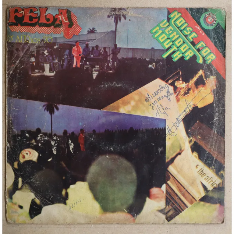 One of Fela's much rarer titles, dirt wear & aging on cover, split on all spine, writings, creases, record has many surface marks, 1" long bite on edge of the vinyl but didn't reach the grooves, constant strong to very reasonable noise, ranges from F to weak VG- depending on parts.