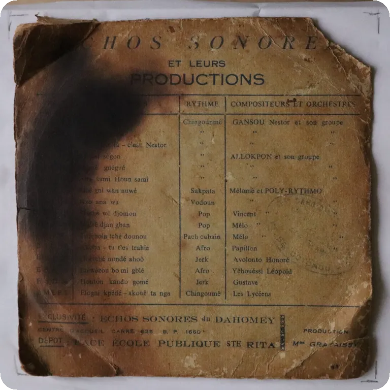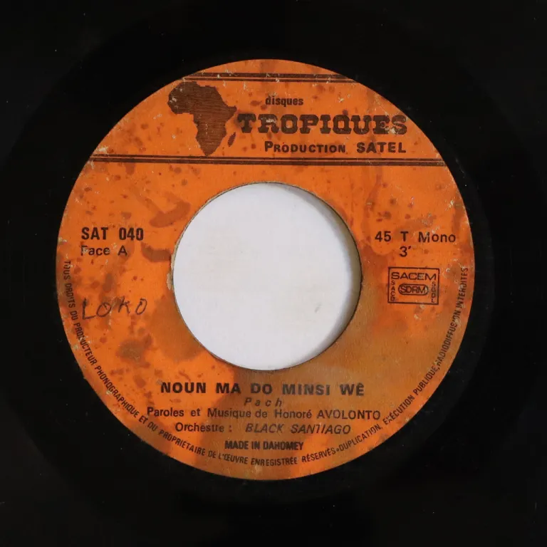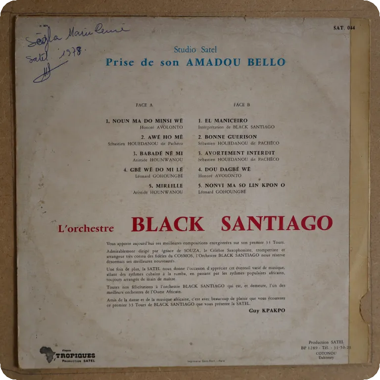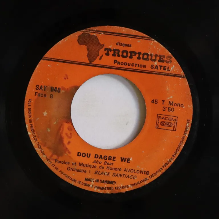 Black Santiago's killer afrobeat winner taken from their first LP + a deep afrolatin cut also taken from their debut album, sleeve is missing, writings, mini peel off, strong dirt & large brown water damage stains on labels, records plays with constant reasonable noise from numerous marks, solid G to VG-.