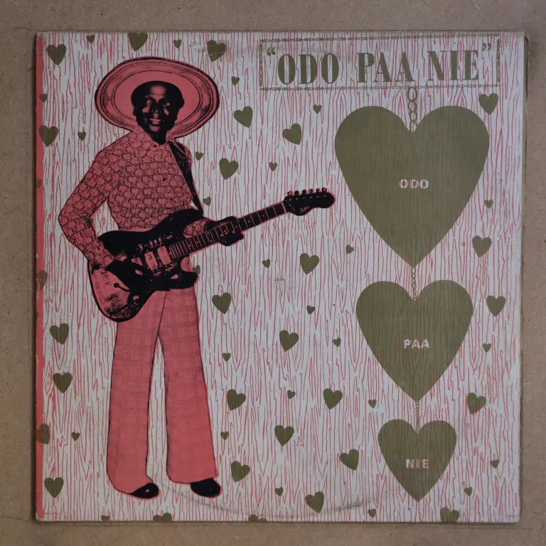 A wider repertoire than usual, including 2 reggae/rock steady tracks, a Congolese rumba, a Beninese agbadja, 2 highlives and a Ghanaian ankaful beat. Sleeve has minor wear, some ringwear, dirt on labels, record plays w/ constant pressing hiss / woosh from numerous flat pressing bubbles, looks scary but plays very decently as one can hear on clips.