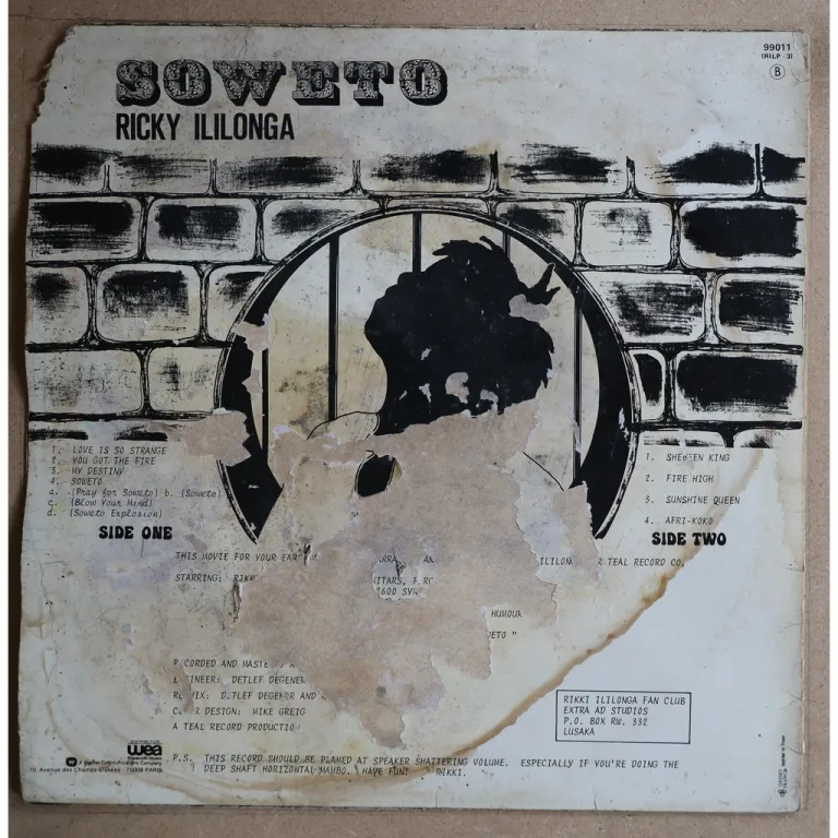 Afro psych funk rock & post psych rock on this scarce Zambian LP. Sleeve has strong aging/dirt, creases, bite on top mouth, peel off & brown water damage on back, warp, rubber stamps on A side label, record has light to hardly noticeable noise from marks
