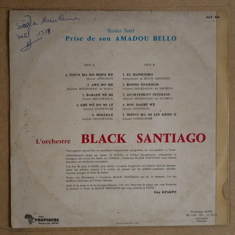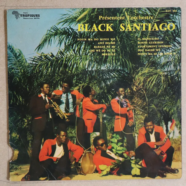 Black Santiago's debut album featuring the killer afrobeat tune "Dou dagbe we" & Ignace de Souza's amazing trumpet solo, also contains a very consistent cover of El manisero. Sleeve w/ wear, some dirt & writings on back, bite on bottom spine, record plays with reasonable noise & clicks and has numerous marks.